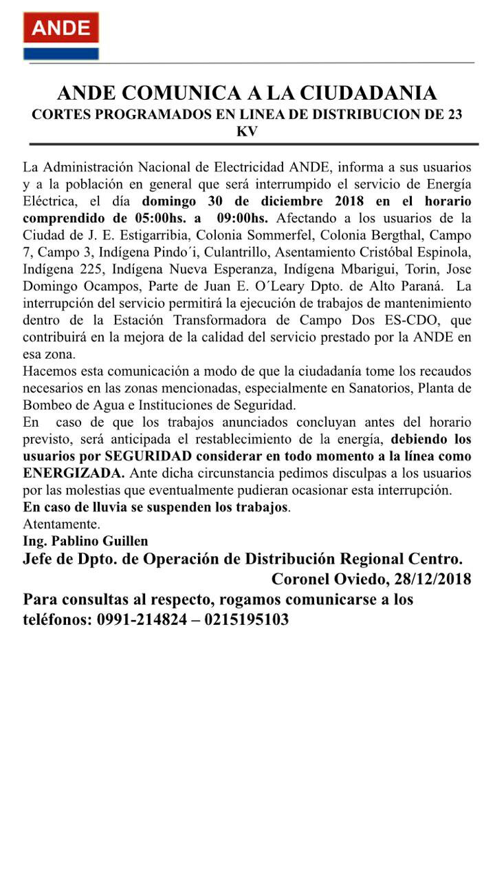La ANDE Regional de J.E.Estigarribia anunció que domingo 30 de diciembre preven corte de energia eléctrica desde las 05:00 hasta las 09:00 hs. Afectaran a varias localidades del distrito.