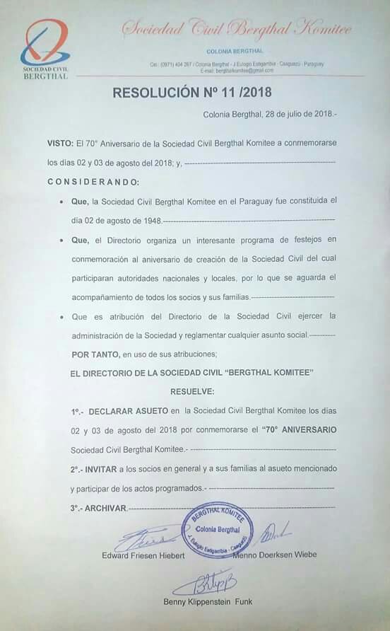 La Sociedad Civil Komitee Bergtal emitió una Resolución por la cual declara dos dias de asueto por motivo de los festejos de 70 años de vida.
