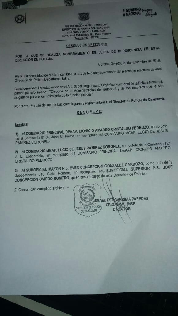 Según la resolución Cristaldo asume el cargo de jefe en la Comisaria de Juan Manuel Frutos.
