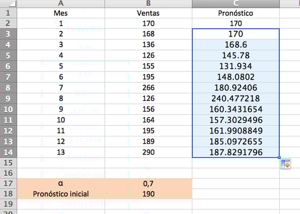 Escoger un valor más cercano a 1 indica que se espera que las ventas se mantengan consistentes con el periodo anterior; en cambio, un valor más cercano a 0 indica más volatilidad. Como verás más adelante, hicimos un ejemplo con una constante de 0.7.