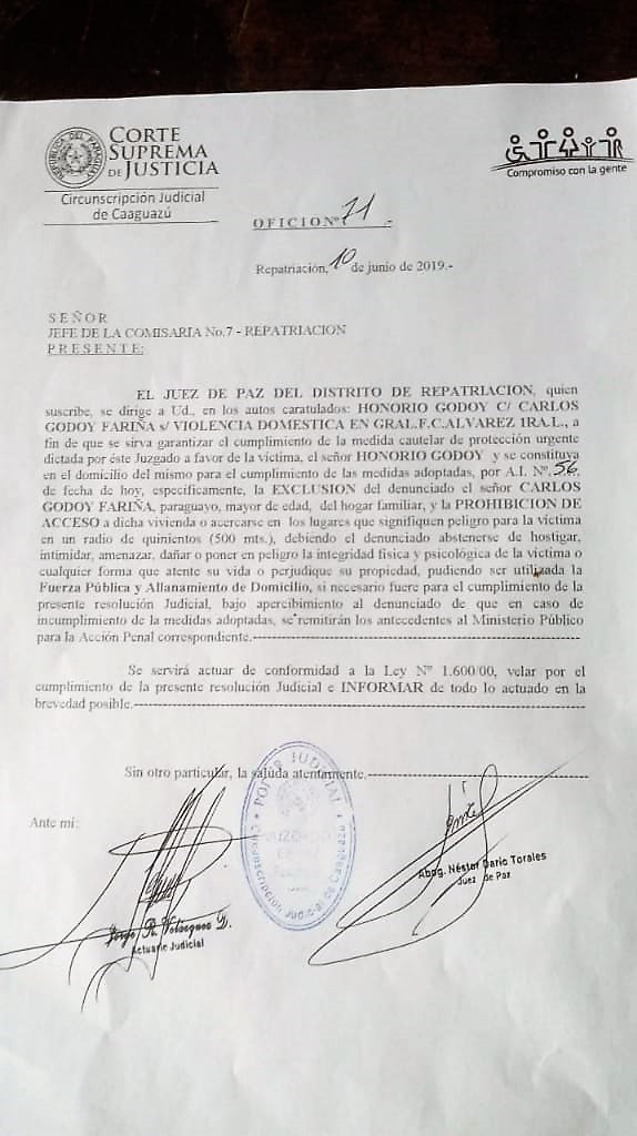 Esta mañana el juez de Paz de Repatriación abogado Nestor Toralez remitió al jefe de la Comisaria de Repatriación un oficio, el numero 71, por el que le comunica la existencia del Auto Interlocutorio (A.I.) n° 56 de la fecha, en virtud del cual el denunciado en el marco de los autos caratulados Honorio Godoy c/ Carlos Godoy Fariña sobre violencia domestica en Francisco Caballero Alvarez, tiene la exclusión del hogar familiar y la prohibición de acceso a dicha vivienda o en los lugares que signifiquen peligro para la victima en un radio de 500 metros debiendo el denunciado abstenerse de hostigar, intimidar, amenazar, dañar o poner en peligro la vida o la propiedad del denunciante.