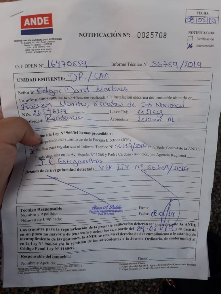 Un usuario denunció que la Ande procedió al corte del servicio de energia eléctrica de un señor. El afectado es de nombre Basilio Arce, la zona de Primera Linea, J. E. Estigarribia.