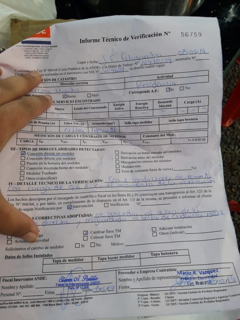 Esta mañana funcionarios de la Ande, con apoyo de efectivos policiales procedieron al corte de las conexiones directas que desde ayer realizaron los usuarios quienes quitaron los medidores en protesta por los precios exhorbitantes del fluído eléctrico.
