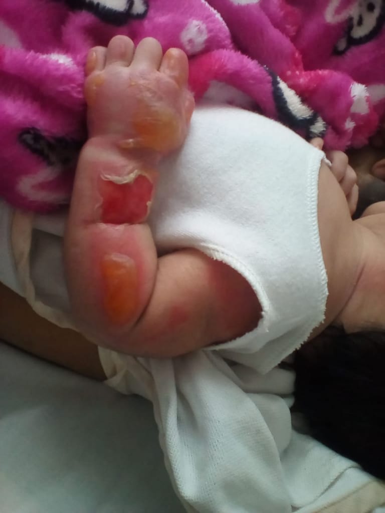 Siempre según el relato de la abuela el dia viernes, la criatura de 2 dias de edad que debía de ser dado de alta con su madre al dia siguiente, fue retirada en horas de la mañana por una enfermera para el baño correspondiente de donde regresó llorando imparablemente, fue ahí cuando la madre revisó a la criatura, constatando las quemaduras en el brazo el pecho y la oreja de acuerdo a la denuncia policial.