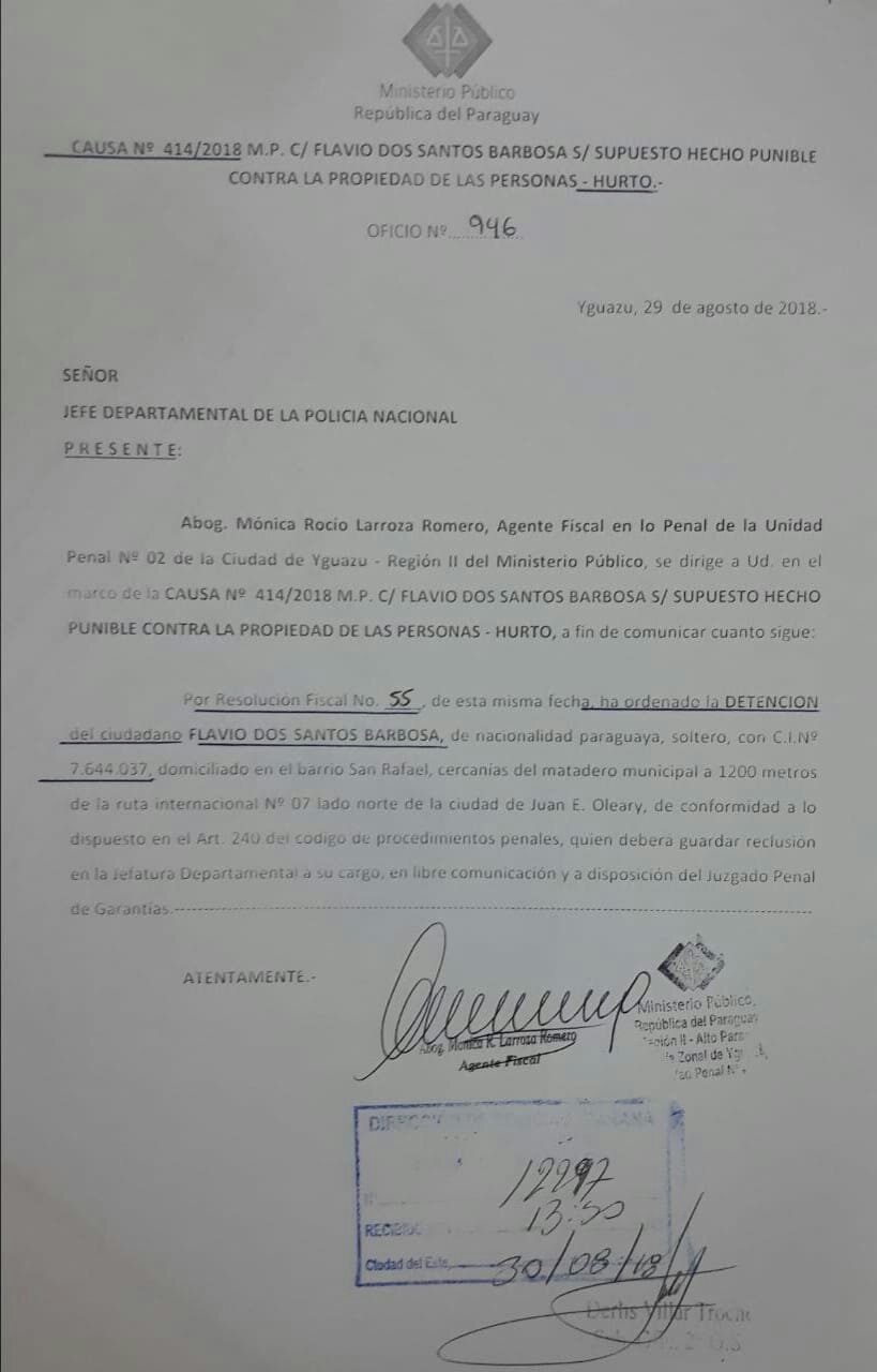 Se trata de FLAVIO DOS SANTOS BARBOSA* paraguayo, soltero, de 35 años de edad, C.I.Nº 7.644.037 , domiciliado en el Barrio San Rafael de la Ciudad Juan E. Oleary, en cumplimiento del Oficio Fiscal Nº946 de fecha 29/Agosto/2018 en los autos caratulados *MINISTERIO PUBLICO C/ FLAVIO DOS SANTOS BARBOSA S/ HECHO PUNIBLE C/ LA PROPIEDAD DE LAS PERSONAS–HURTO* individualizado en la *Causa Nº 414/2018* emanada de la Unidad Fiscal en lo Penal Nº 02 de la Ciudad de Yguazú firmado por la *Abog. MONICA ROCIO LARROSA* Agente Fiscal