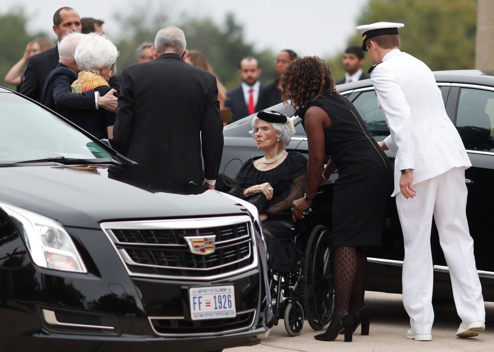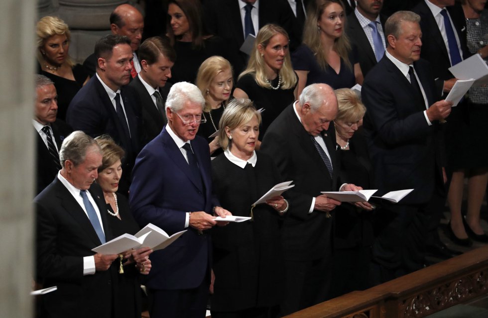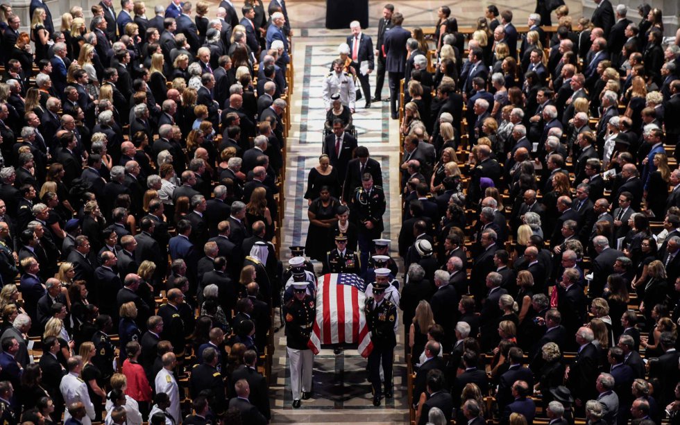 Cargado por militares de gala, el ataúd del soldado McCain había entrado en la catedral un rato antes en medio de un silencio atronador. La madre, Roberta McCain, despidiendo hierática a su hijo con 106 años, parecía otra esfinge castrense más. Toda la mayor plana del Capitolio, republicanos y demócratas, además de tres expresidentes (junto a Obama y Bush se sentaban Bill y Hillary Clinton), y el exsecretario de Estado Henry Kissinger dijeron adiós al senador.