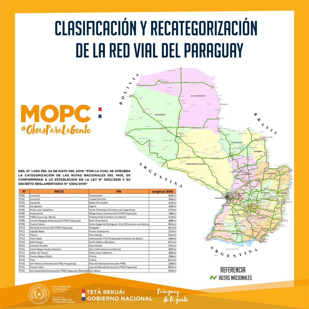 De esta manera, Paraguay pasa a tener 8.756 km catalogadas como nuevas rutas nacionales, totalizando de esta manera 22. En la Región Oriental del país, de 3.494 km ahora se pasa a tener 5.502 km de rutas pavimentadas, mientras que, en que el Chaco, de 2 Rutas Nacionales (La ruta N° IX y la ruta N° XII), ahora pasará a tener 6, totalizando 3.554 km que apuestan al desarrollo de toda la Región Occidental.