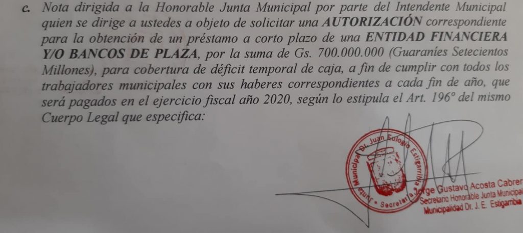 Mediante nota dirigida a la Junta Municipal de la ciudad de Dr. J. E. Estigarribia, El intendente Derlis Espinola solicitó se le autorice vía ordenanza municipal la obtención de un crédito de corto plazo de 700 millones de guaraníes.
