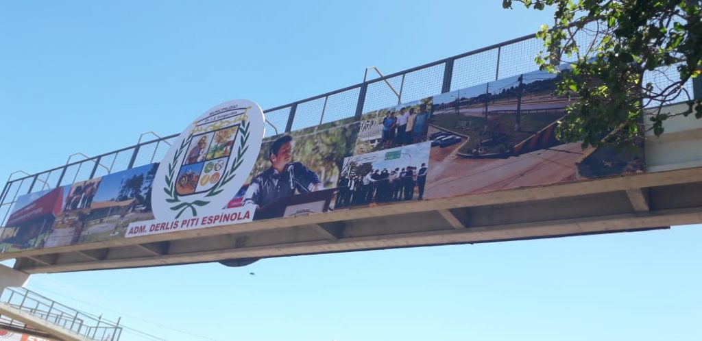 La gigantografía ha sido emplazada en uno de los costados del puente peatonal que cruza la ruta internacional 02PY. Al otro lado de la misma se ha instalado anteriormente la de una empresa de reciente inauguración.