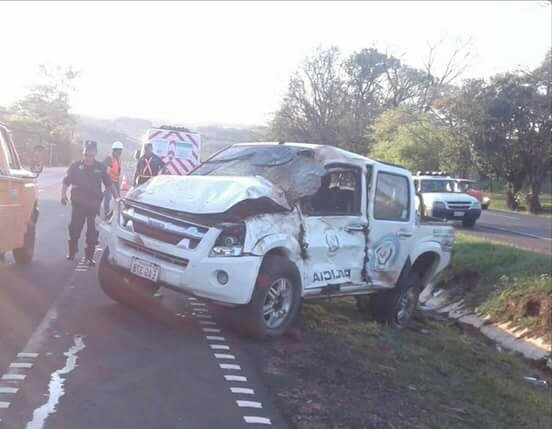 JUAN MANUEL FRUTOS. El vuelco de una camioneta patrullera ocurrió este jueves, a las 16:45hs aproximadamente, a la altura del Km. 194 de la Ruta VII «Dr. José Gaspar Rodríguez de Francia» Compañía Guyraungua de Juan Manuel Frutos, Departamento de Caaguazú.