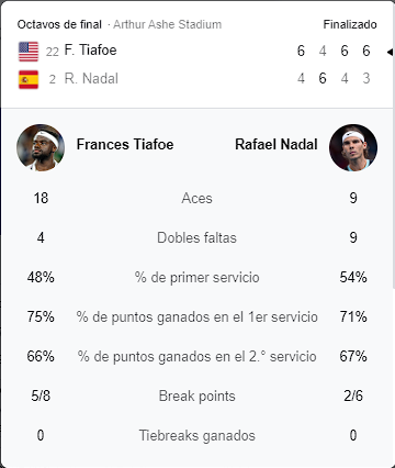 El norteamericano Frances Tiafoe de 24 años, venció 3 set a 1 al legendario tenista español Rafael Nadal en un titánico partido por el marcador de 6-4, 4-6, 6-4 y 6-3 en el marco de los 8vos de final del Abierto de Estados Unidos. El Abierto de Estados Unidos es la edición número 142 y el último evento de Grand Slam del año.