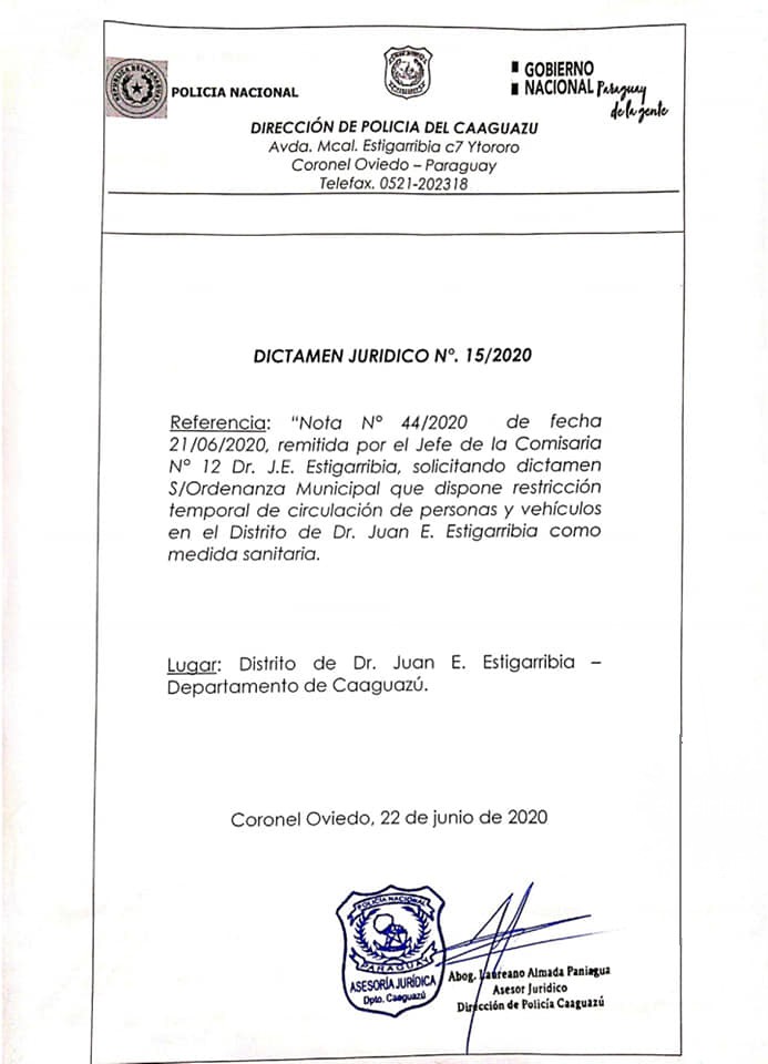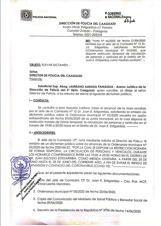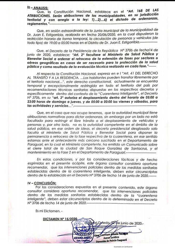 El referido dictámen jurídico no es vinculante para la ordenza 05/2020 en cuanto a que solamente fue a modo de aclaratoria al pedido del Comisario Osval Lesme, jefe de la comisaria distrital, quien ante la contraposición evidente con el decreto presidencial 3706 solicitó esa opinión jurídica.