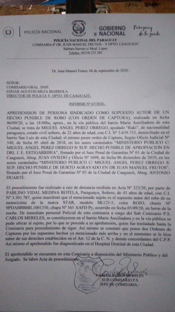 Sin embargo el mismo fue detenido a raíz de la denuncia de hurto agravado que fuera formulado por Pablino Medina quien lo acusó de un presunto hurto agravado de una motocicleta de su propiedad.