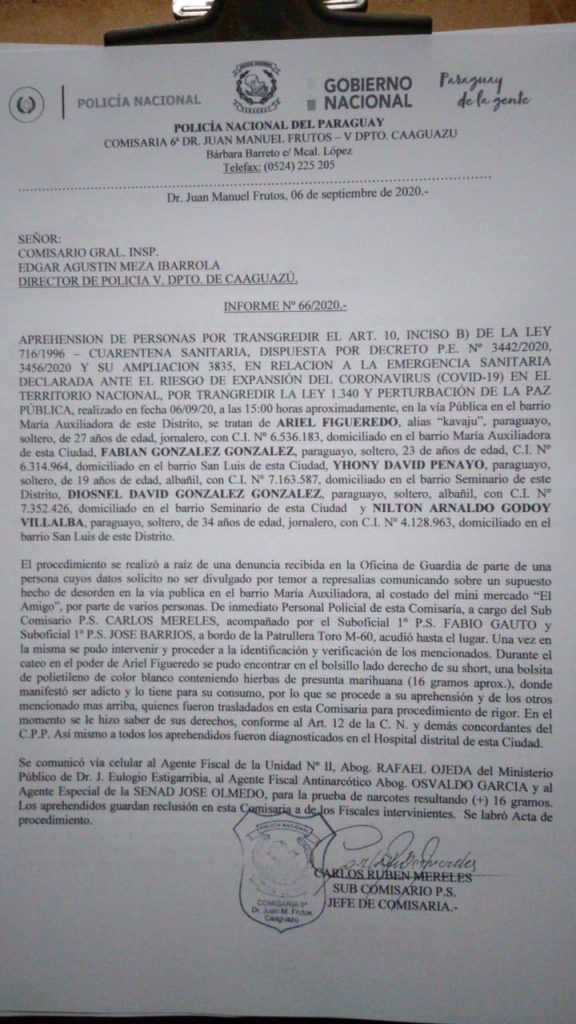 Ariel Figueredo, Fabian Gonzalez, Yhony David Penayo, Disonel David González y Nilton Arnaldo Godoy fueron detenidos el día de ayer en horas de la tarde en el centro de la ciudad.